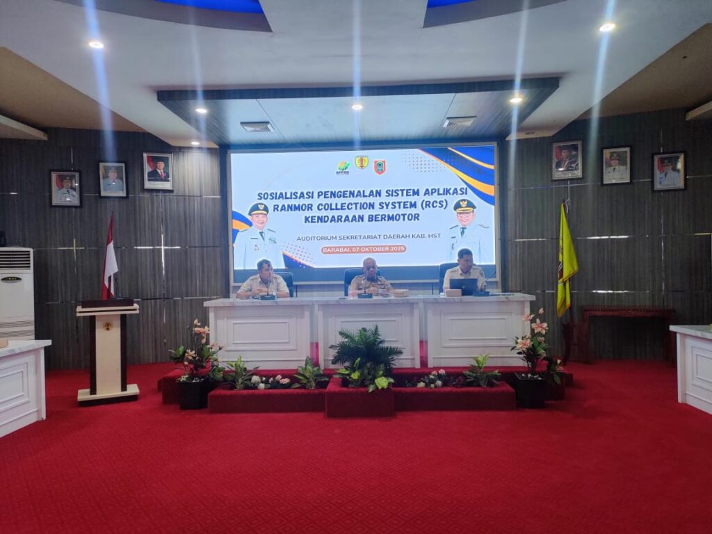 Barabai,7 Oktober 2025, kegiatan sosialisasi pengenalan Sistem Aplikasi Ranmor Collection System (RCS) kendaraan bermotor diselenggarakan di Auditorium Sekretariat Daerah Kabupaten